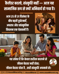 ✴️25 दिसंबर से 31 दिसंबर के बीच का समय अब केवल साल के अंतिम दिन नहीं रह गया है, बल्कि यह भारत जैसे देश में एक सामाजिक संकट के कालखंड के रूप में उभरता जा रहा है। इन कुछ दिनों में जो घटनाएँ सामने आती हैं, वे यह सोचने को मजबूर करती हैं कि समस्या केवल किसी एक तारीख की नहीं, बल्कि उस सोच की है जो विदेशी उत्सव-संस्कृति के अंधानुकरण से जन्म ले रही है। यही वह बिंदु है जहाँ “कैलेंडर बदलो, संस्कृति नहीं” का विचार अत्यंत आवश्यक और प्रासंगिक हो जाता है।