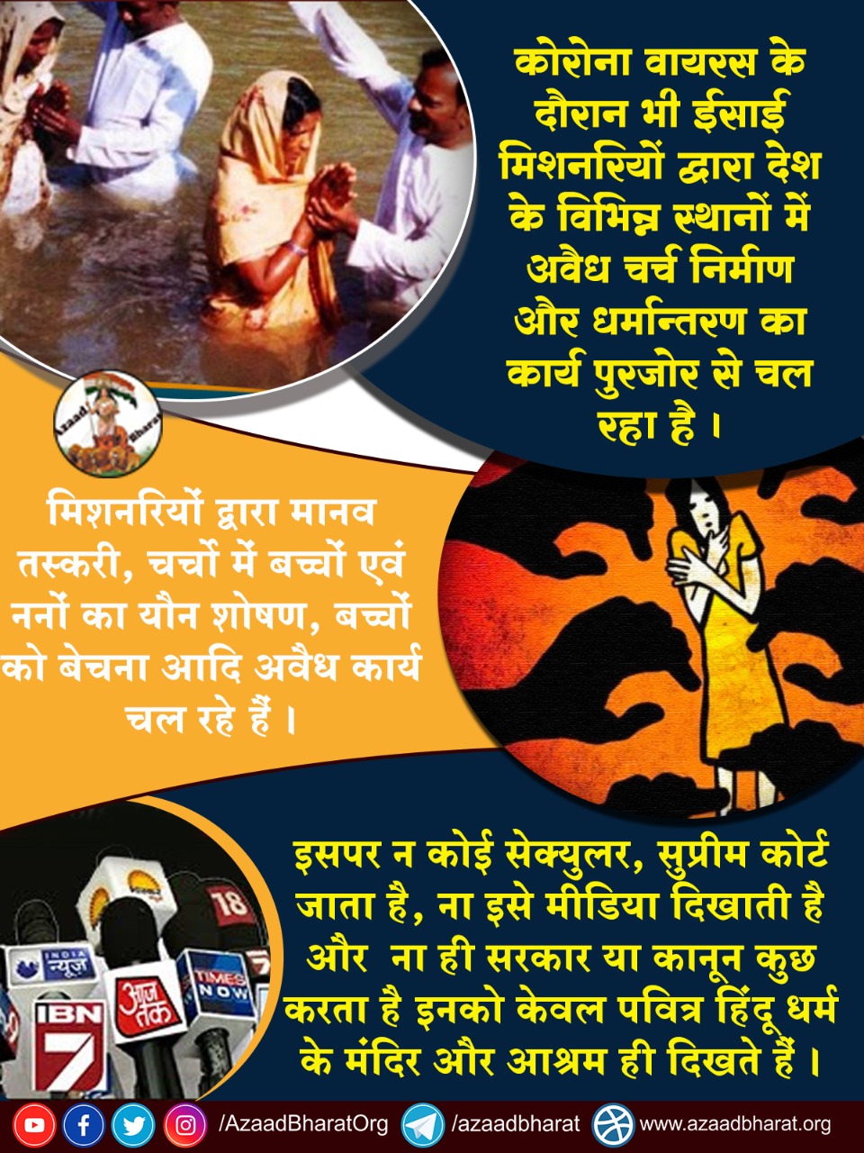 झारखण्ड से समाचार ये भी मिल रहे हैं कि मदर टेरेसा से सम्बंधित संगठन की ईसाई नन बच्चें बेचते पकड़ी गई हैं। 280 बच्चों की गुमशुदगी की खबर है। कभी केरल से समाचार मिलता है कि पादरियों ने नन का यौन शोषण किया। कभी समाचार मिलता है कि ईसाई अनाथालय में बच्चों का यौन शोषण हुआ। कभी समाचार मिलता है कि तमिलनाडु में ईसाई संस्था अंगों को निकाल कर बेचती हैं। मीडिया इन ख़बरों को कभी प्रमुखता से नहीं दिखाता। इसके कुछ दिनों पहले तक गोवा और दिल्ली के ईसाई आर्कबिशप देश में भय के माहौल की बात कर रहे थे बड़ी प्रमुखता से दिखाते हैं।