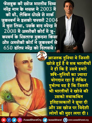 फेसबुक तो एक नमूना है बाकी सर्जरी हो, हवाई जहाज हो, परमाणु हथियार हो अथवा बिजली से लेकर शरीर के स्वास्थ्य तक कि सारी खोजे हमारे ऋषि-मुनियों ने की है लेकिन आज हम असली इतिहास छुपाकर नकली इतिहास पढ़ाया जाता है जिसके कारण आज हम असली भारतीय खोजकर्ताओं को भुला रहे हैं, अब समय की मांग रहते हुए असली इतिहास पढ़ाया जाना चाहिए।