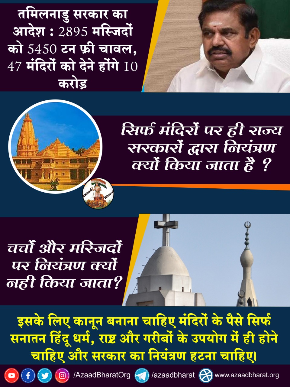 ऐसे समय में, जब मंदिर प्रशासन को सरकार के चंगुल से मुक्त कराने के लिए संघर्ष तेज हो रहा है, तमिलनाडु सरकार के हिंदू धार्मिक और धर्मार्थ बंदोबस्ती विभाग (HR and CE) ने 47 मंदिरों को गरीबों की देखभाल करने के लिए निर्धारित राशि के अलावा CM राहत कोष में 10 करोड़ रुपए अतिरिक्त देने का निर्देश दिया है।