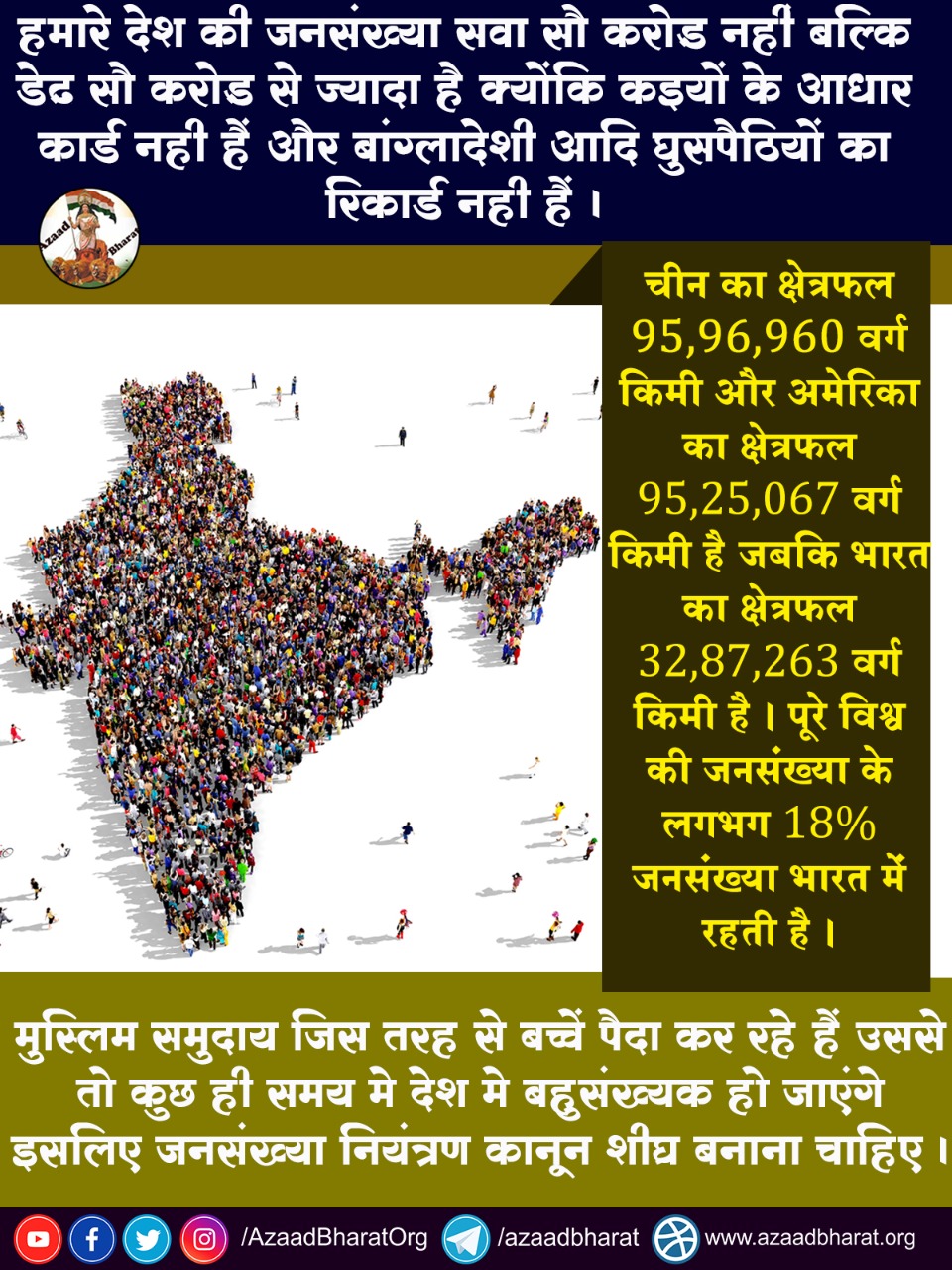 भारत मे हिंदू ज्यादा बच्चें पैदा नही कर रहे है, मुस्लिम अपनी जनसंख्या बढ़ाने में तेजी से लगे है , रिपोर्ट के अनुसार अगर ऐसे ही वे जनसंख्या बढ़ाते रहे तो एकदिन हिंदू अल्पसंख्यक हो जाएंगे और मुस्लिम बहुसंख्यक फिर पाकिस्तान और बांग्लादेश से भी बुरी हालत भारत मे हिदुओं की होगी इसलिए जनसंख्या नियंत्रण कानून लाना अत्यंत महत्वपूर्ण हैं।