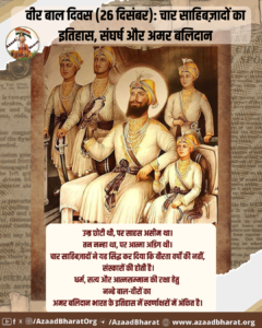 🇮🇳भारत का इतिहास केवल राजाओं और साम्राज्यों की गाथाओं तक सीमित नहीं है, बल्कि यह धर्म, सत्य, आत्मसम्मान और बलिदान के लिए अडिग खड़े होने वाले असंख्य वीरों की अमर कहानी है। इन्हीं गाथाओं में एक ऐसा स्वर्णिम अध्याय है जो मानव इतिहास में साहस, त्याग और धर्मनिष्ठा की चरम सीमा को उजागर करता है—सिखों के दसवें गुरु, श्री गुरु गोबिंद सिंह जी महाराज के चार साहिबज़ादों का बलिदान। इन चार बाल-वीरों की स्मृति में प्रतिवर्ष 26 दिसंबर को वीर बाल दिवस मनाया जाता है, जो न केवल स्मरण का माध्यम है बल्कि चरित्र निर्माण, नैतिक साहस और राष्ट्रधर्म की जीवंत शिक्षा का प्रतीक भी है।