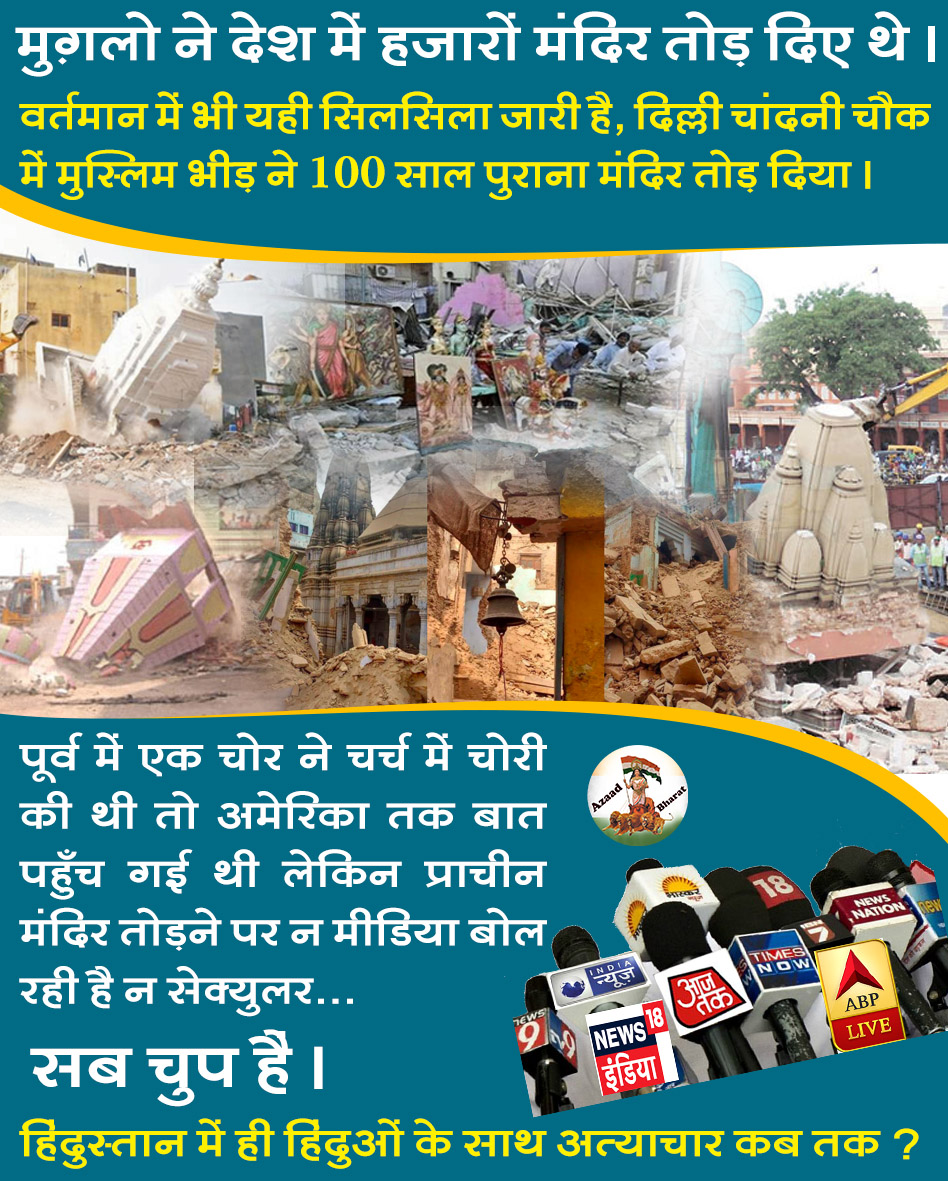 जी हाँ देश की राजधानी दिल्ली में माँ दुर्गा जी के 100 साल पुराने मंदिर को जिहादियों द्वारा ‘अल्लाहु अकबर’ नारे के साथ बेरहमी से तोड़ दिया गया । मामला पुरानी दिल्ली के लाल कुआं इलाके की दुर्गा मंदिर गली का है, जहाँ पार्किंग न देने की वजह से इस घटना को अंजाम दिया गया । हिंदुओं के घर मे घुसकर बहन-बेटियों और हिंदुओं को प्रताड़ित किया गया। जिस पर पूरे देश की जनता ने आक्रोश व्यक्त किया ।