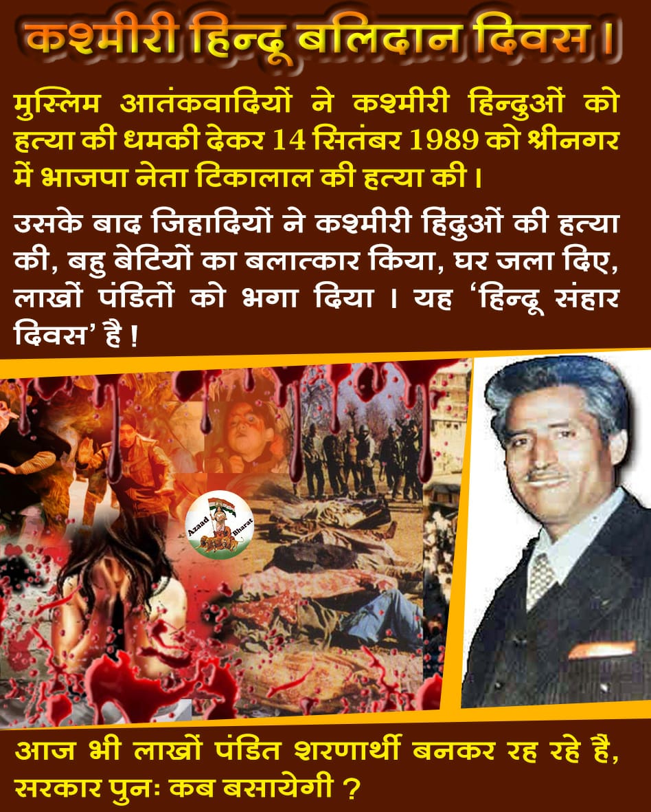 मुस्लिम आतंकवादियों ने 14 सितंबर के दिन कश्मीरी हिन्दूओं को धमकी देकर सर्वप्रथम 14 सितम्बर 1989 को श्रीनगर में हिंदुओं की रक्षा करने वाले भाजपा नेता श्री टिकालाल की हत्या की थी। उसके बाद 19 जनवरी 1990 को लाखों कश्मीरी हिंदुओं को सदा के लिए अपनी धरती, अपना घर छोड़ कर अपने ही देश में शरणार्थी होना पड़ा। वे आज भी शरणार्थी हैं। उन्हें वहां से भागने के लिए बाध्य करने वाले भी कहने को भारत के ही नागरिक थे, और आज भी हैं। उन कश्मीरी इस्लामिक आतंकवादियों को वोट डालने का अधिकार भी है, पर इन हिन्दू शरणार्थियों को वो भी नहीं !