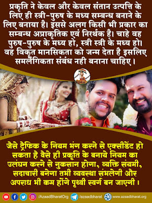 हमें इस तथ्य पर विचार करने की आवश्यकता है कि अप्राकृतिक सम्बन्ध समाज के लिए क्यों अहितकारक है। अपने आपको आधुनिक बनाने की हौड़ में स्वछन्द सम्बन्ध की पैरवी भी आधुनिकता का परिचायक बन गया है। सत्य यह है कि इसका समर्थन करने वाले इसके दूरगामी परिणामों की अनदेखी कर देते हैं। प्रकृति ने मानव को केवल और केवल स्त्री-पुरुष के मध्य सम्बन्ध बनाने के लिए बनाया है। इससे अलग किसी भी प्रकार का सम्बन्ध अप्राकृतिक एवं निरर्थक है। चाहे वह पुरुष-पुरुष के मध्य हो या स्त्री-स्त्री के मध्य हो। वह विकृत मानसिकता को जन्म देता है। उस विकृत मानसिकता कि कोई सीमा नहीं है। उसके परिणाम आगे चलकर बलात्कार (Rape) , सरेआम नग्न होना (Exhibitionism), पशु सम्भोग (Bestiality), छोटे बच्चों और बच्चियों से दुष्कर्म (Pedophilia), हत्या कर लाश से दुष्कर्म (Necrophilia), मार पीट करने के बाद दुष्कर्म (Sadomasochism) , मनुष्य के शौच से प्रेम (Coprophilia) और न जाने किस-किस रूप में निकलता हैं। अप्राकृतिक सम्बन्ध से संतान न उत्पन्न हो सकना क्या दर्शाता है? सत्य यह है कि प्रकृति ने पुरुष और नारी के मध्य सम्बन्ध का नियम केवल और केवल संतान की उत्पत्ति के लिए बनाया था। आज मनुष्य अपने आपको उन नियमों से ऊपर समझने लगा है। जिसे वह स्वछंदता समझ रहा है। वह दरअसल अज्ञानता है। भोगवाद मनुष्य के मस्तिष्क पर ताला लगाने के समान है। भोगी व्यक्ति कभी भी सदाचारी नहीं हो सकता। वह तो केवल और केवल स्वार्थी होता है। इसीलिए कहा गया है कि मनुष्य को सामाजिक हितकारक नियम पालन का करने के लिए बाध्य होना चाहिए। जैसे आप अगर सड़क पर गाड़ी चलाते हैं तब आप उसे अपनी इच्छा से नहीं अपितु ट्रैफिक के नियमों को ध्यान में रखकर चलाते हैं। वहाँ पर क्यों स्वछंदता के मौलिक अधिकार का प्रयोग नहीं करते? अगर करेंगे तो दुर्घटना हो जायेगी। जब सड़क पर चलने में स्वेच्छा की स्वतंत्रता नहीं है। तब स्त्री पुरुष के मध्य संतान उत्पत्ति करने के लिए विवाह व्यवस्था जैसी उच्च सोच को नकारने में कैसी बुद्धिमत्ता है?