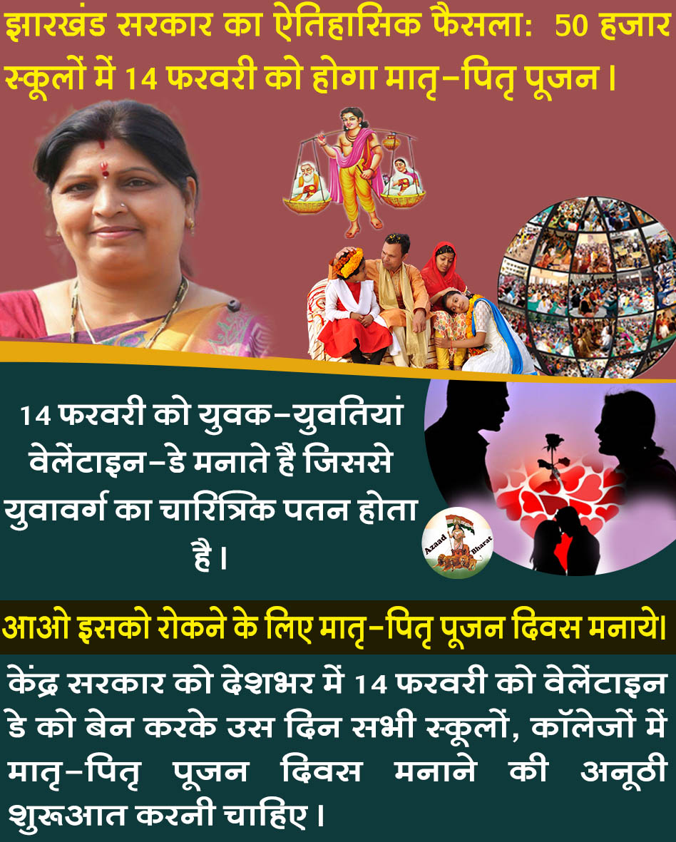 पाश्चात्य संस्कृति के इस त्यौहार वैलेंटाइन-डे को रोकने के लिए पिछले साल से झारखंड सरकार ने एक ऐतिहासिक फैसला लिया है जिसमें सभी सरकारी स्कूलों में 14 फरवरी को वैलेंटाइन-डे की जगह मातृ-पितृ पूजन दिवस मनाया जाएगा ।