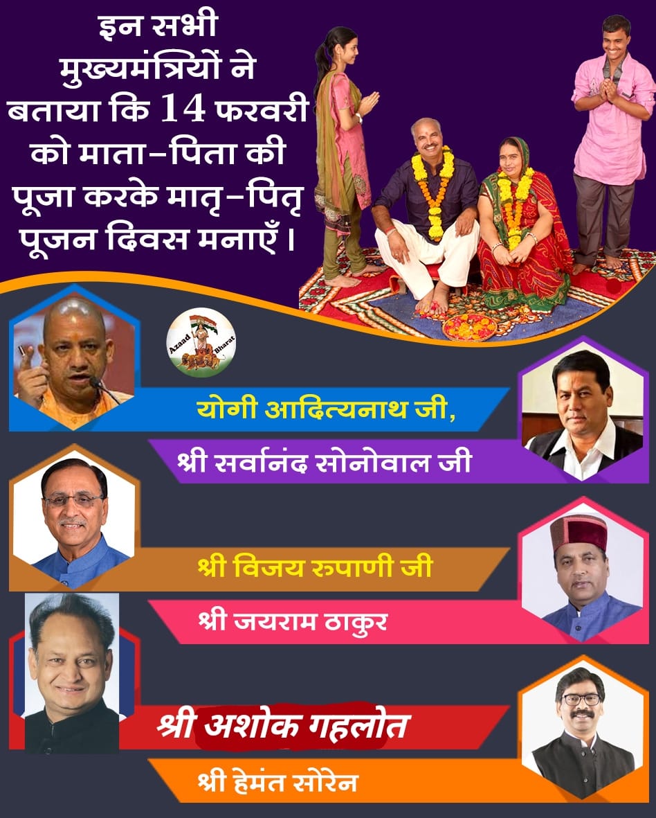 आपको बता दें कि असम के मुख्यमंत्री श्री सर्वानंद सोनोवाल जी एवं गुजरात के मुख्यमंत्री श्री विजय रुपाणी जी ने भी 14 फ़रवरी को मातृ-पितृ पूजन की भारी प्रशंसा की है और वैलेंटाइन डे की जगह मातृ-पितृ पूजन मनाने की अपील की है। आपको बता दें कि इन सभी ने पिछले साल पत्र लिखकर अपनी शुभकामनाएं प्रेषित की थी।