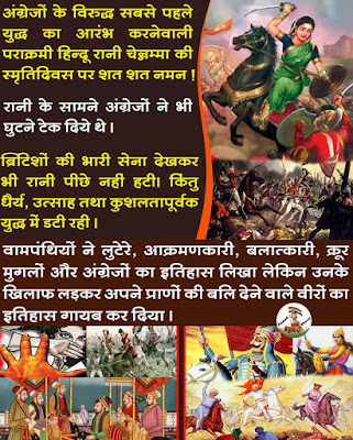 आपने पराक्रमी हिन्दू रानी चेन्नम्मा के बारे में पढ़ा, पति और पुत्र का स्वर्गवास हो गया, सामने अंग्रेजो की बड़ी सेना थी उसके बाद भी वो अंग्रेजो से लडी भले किसी ने गद्दारी की और वो हार गई लेकिन वे मन से कभी नहीं हारी आखिरी समय जेल में बिताना पड़ा फिर भी दुःखी नही हुई और सनातन हिन्दू धर्मग्रंथों का पठन करती रही । यही भारतीय संस्कृति है कि सामने कितनी भी विकट परिस्थिति आ जाये लेकिन हारना नहीं है धैर्य पूर्वक सामना करते रहना चाहिए ।