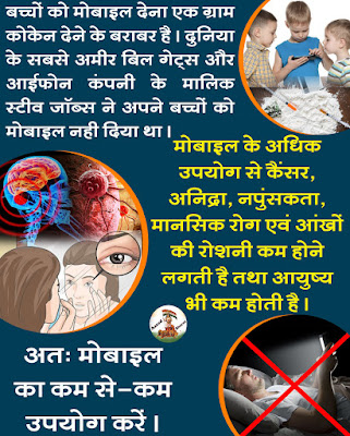 मोबाइल के उपयोग से फायदा कम और नुकसान ज्यादा होता है, अतः मोबाइल का कम से कम उपयोग करें और बच्चों को भूलकर भी न दें ।