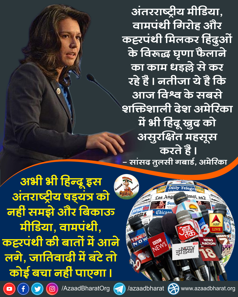 *अंतरराष्ट्रीय मीडिया, वामपंथी गिरोह और कट्टरपंथी मिलकर हिंदुओं के विरूद्ध घृणा फैलाने का काम धड़ल्ले से कर रहे हैं। नतीजा ये है कि आज विश्व के सबसे शक्तिशाली देश और सबसे बड़े लोकतंत्र में भी हिंदू खुद को असुरक्षित महसूस करते हैं। हिंदुओं की लाचारी, उनकी बेबसी और उनके प्रति नफरत फ़ैलाने की बात को अमेरिकी राजनेता तुलसी गबार्ड भी मानती हैं। तुलसी अमेरिका की पहली हिंदू सांसद हैं। वे उन तीन दावेदारों में भी शामिल हैं जिनमें से डेमोक्रेटिक पार्टी की ओर से राष्ट्रपति पद का उम्मीदवार चुना जाना है। बकौल तुलसी, हिंदूफोबिया एक सच्चाई है। उन्होंने भी इसे कई बार झेला है। यहां तक कि कांग्रेस चुनाव और राष्ट्रपति उम्मीदवारी के अपने अभियान के दौरान भी।*