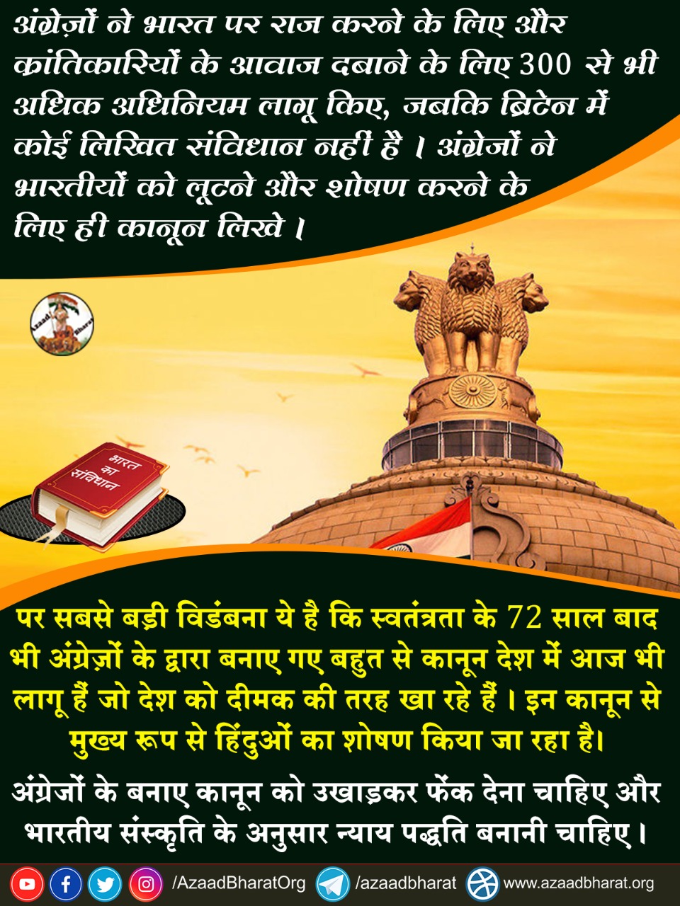 पर सबसे बड़ी विडंबना ये है कि अंग्रेज़ों के बनाये गए बहुत से कानून देश में आज भी लागू है। भले ही देश अंग्रेजों से 72 साल पहले आज़ाद हो गया हो पर अंग्रेज़ों के कानूनों से आज तक आज़ाद नहीं हो पाया है। फर्क सिर्फ इतना है कि आजादी से पहले अंग्रेज इस कानून द्वारा भारतीयों का शोषण करते थे और आज कुछ भारतीय बाकी भारतीयों का शोषण करते हैं। सेकुलरिज्म की आड़ में हिंदुओं को कानून द्वारा प्रताड़ित करना हिन्दू विरोधी ताकतों का प्रमुख हथियार बन चुका है।