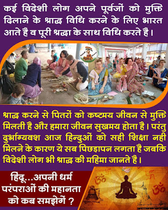 इन विदेशियों को हिन्दू धर्म के अनुसार आचरण करते देख, हिन्दू धर्म की महानता हमारें ध्यान में आती है। माता-पिता तथा अन्य निकट संबंधियों की मृत्युपरांत की यात्रा सुखमय एवं क्लेशरहित हो तथा उन्हें सद्गति मिले, इस हेतु किया जानेवाला संस्कार है ‘श्राद्ध’। श्राद्धविधि करने से पितरों की कष्ट से मुक्ति हो जाती है और हमारा जीवन भी सुसह्य हो जाता है। परंतु दुर्भाग्यवश आज हिंदुओं को धर्म मे बताई गई ऐसी विधी करना पिछडापन लगता है। उनके मॉडर्न जीवनशैली को श्राद्ध करने जैसी कृति अंधश्रद्धा लगती है।