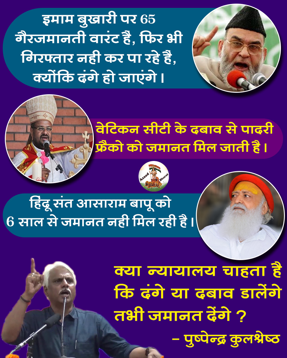 ऐसे ही अभी वर्तमान में हिंदू संत आसाराम बापू को 6 साल से जमानत नही मिल रही है उसपर पुष्पेंद्र कुलश्रेष्ठ जी ने बताया कि दिल्ली के इमाम बुखारी पर 65 गैरजमानती वारंट है, राष्ट्र द्रोह, बलात्कार आदि के संगीन आरोप है फिर भी गिरफ्तार नही करते है क्योंकि सरकार और न्यायपालिका बोलती है कि दंगे हो जायेगे।