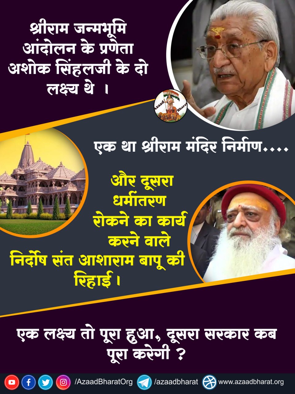 अयोध्या में शिलान्यास पर संतों ने किया याद गौर करियेगा कि केवल सिंघल या स्वामी ही बापू को निर्दोष मानते हैं ऐसा नहीं है। अयोध्या के दिग्गज महंत एवं श्रीराम जन्मभूमि न्यास के अध्यक्ष नृत्यगोपालदासजी का भी यही मानना है। वे साफ तौर पर कह चुके हैं कि ‘‘संत आशारामजी बापू के प्रति जनता में बहुत भारी श्रद्धा है अतः दोष लगाने के लिए षड्यंत्रकारियों को कोई-न-कोई सहारा चाहिए। इसलिए इस प्रकार से सहारा लेकर उन्होंने चारित्रिक दोष की कल्पना की है लेकिन आशारामजी बापू महात्मा हैं। ।’’https://youtu.be/ YegncME19aU