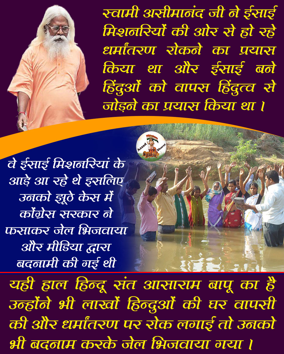 अब आपने देखा कि जो भी भारत मे ईसाई मिशनरियों के द्वारा हो रहे धर्मांतरण पर रोक लगाते थे उनको षडयंत्र करके जेल भेजवाया जाता था यही हाल हिन्दू संत आसाराम बापू का है उन्होंने जो ईसाई धर्म मे चले गए थे उन लाखों हिन्दुओं की घरवासपी करवाई अपने धर्म वापिस लाये और गांव-गांव नगर-नगर जाकर लोगो को हिन्दू संस्कृति की महिमा बताई और आदिवासी इलाकों में जीवनुपयोगी वस्तुओं दी एवं मकान बनाकर दिए जिससे आदिवासी हिन्दू धर्म छोड़कर ईसाई न बने जिसके कारण ईसाई मिशनरियों के आँखों मे खटक रहे थे, फिर वेटिकन सिटी के इशारे पर सोनिया गांधी ने बापू आसारामजी की मीडिया में खूब बदनामी करवाई और झूठे केस बनाकर जेल भिवजाय ।