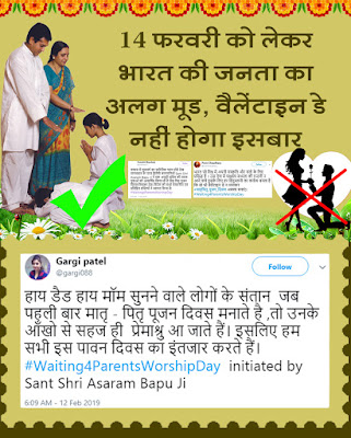 अब गांव- गांव शहर- शहर मातृ-पितृ पूजन दिवस की लोकप्रियता बढ़ती जा रही है। Sant Shri Asaram Bapu Ji के द्वारा 14 फरवरी को जो” मातृ-पितृ पूजन दिवस” का शंखनाद किया है उसकी गूंज चारो तरफ फैल चुकी है।#Waiting4ParentsWorshipDay https://twitter.com/