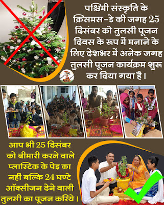 पश्चिमी संस्कृति का, क्रिसमस-डे, मनाने जैसा त्यौहार नहीं है इसलिए भारत में ज्यादातर लोगों ने 25 दिसंबर को तुलसी पूजन दिवस के रूप में मनाने के लिए पहले से ही तुलसी पूजन शुरू कर दिया है, भारत ही नहीं बल्कि कई अन्य देशों में भी इस दिन को तुलसी पूजन दिवस के रूप में मनाया जा रहा है ।*