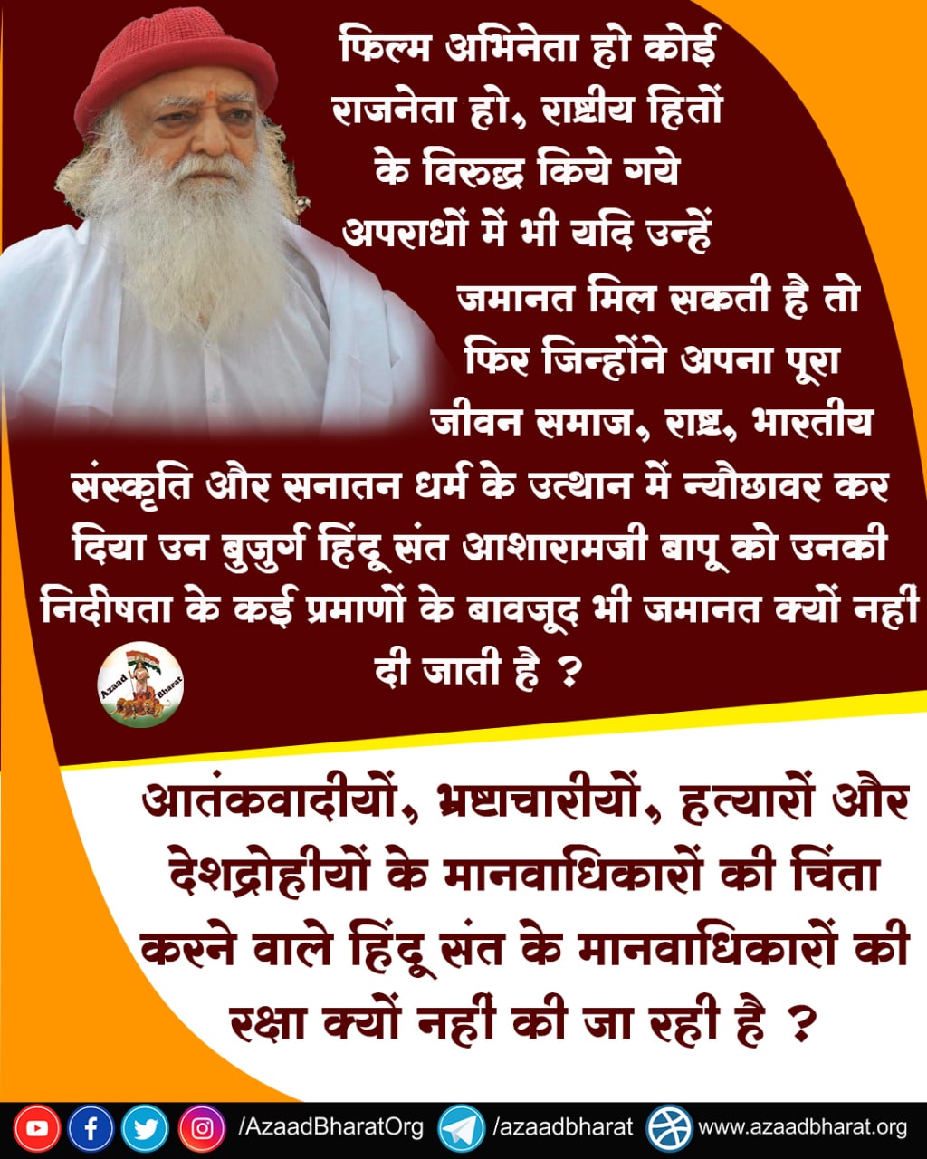 ऐसे अनेक उदाहरण है कि चाहे कोई प्रसिद्ध फिल्म अभिनेतओं हो कोई राजनेता हो जिन्हें राष्ट्रीय हितों के विरुद्ध किये गये अपराधों में सजा सुनाई गई हो हजारो निर्दोष लोगों की हत्या में शामिल होने का जिनके ऊपर आरोप हो उन्हे भी एक सजायाफता कैदी के रुप में कानून में दिये गये लाभ या सुविधा उपलब्ध काराई गयी तो बापू आशारामजी जैसे संत जिन्होंने अपना पूरा जीवन भारतीय संस्कृति और सनातन धर्म के उत्थान में न्योछावर कर दिया देश के हर वर्ग, धर्म, मत, पंथ, मजहब के करोडो लोग बिना किसी भेदभाव के उनके सत्संग-प्रवचनों और सेवाकार्यों से वर्षों तक लाभान्वित होते रहें तो उन्हें उन लाभों से वंचित क्यों किया जा रहा है ।