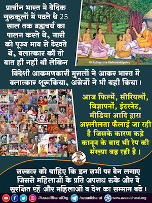 भारतीय संस्कृति में नारी को नारायणी का दर्जा दिया गया है और उसको पूज्य भाव से देखते हैं और अपनी पत्नी के अलावा परस्त्री को माता समान माना जाता हैं। प्राचीन भारत मे बच्चों को गुरुकुल में भेजते थे उसमे 25 वर्ष तक ब्रह्मचर्य का पालन करते थे। किसी भी बहन बेटी के सामने बुरी नजर से भी नही देखते थे बलात्कार की तो बात ही नहीं लेकिन भारत में विदेशी मुगल आक्रमणकारियों ने आकर भारत की बहू-बेटियो, माताओं के साथ बलात्कार किया उसके बाद अंग्रेजों ने भी यही सिलसिला जारी रखा, प्राचीन भारत मे कभी बलात्कार शब्द ही नही था।