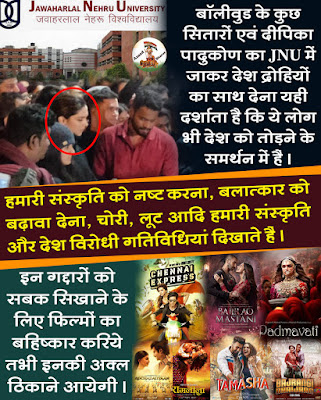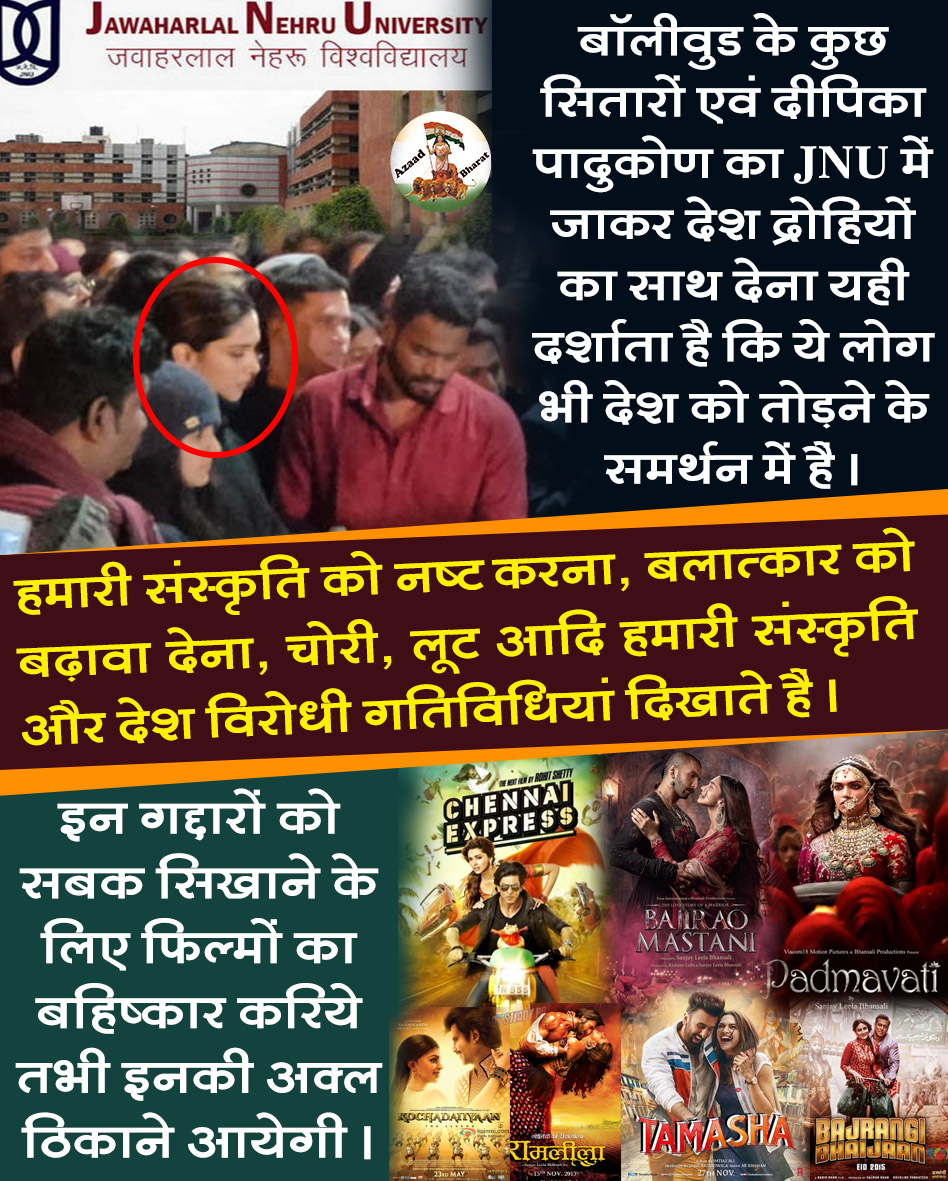 *🚩बॉलीवुड के कुछ सितारे CAA का विरोध कर रहे हैं, कुछ वामपंथी JNU के समर्थन में आये हद तो तब हो गई जब देश विरोधी लोगों का समर्थन देने के लिए अभिनेत्री दीपिका पादुकोण भी पहुँच गई*