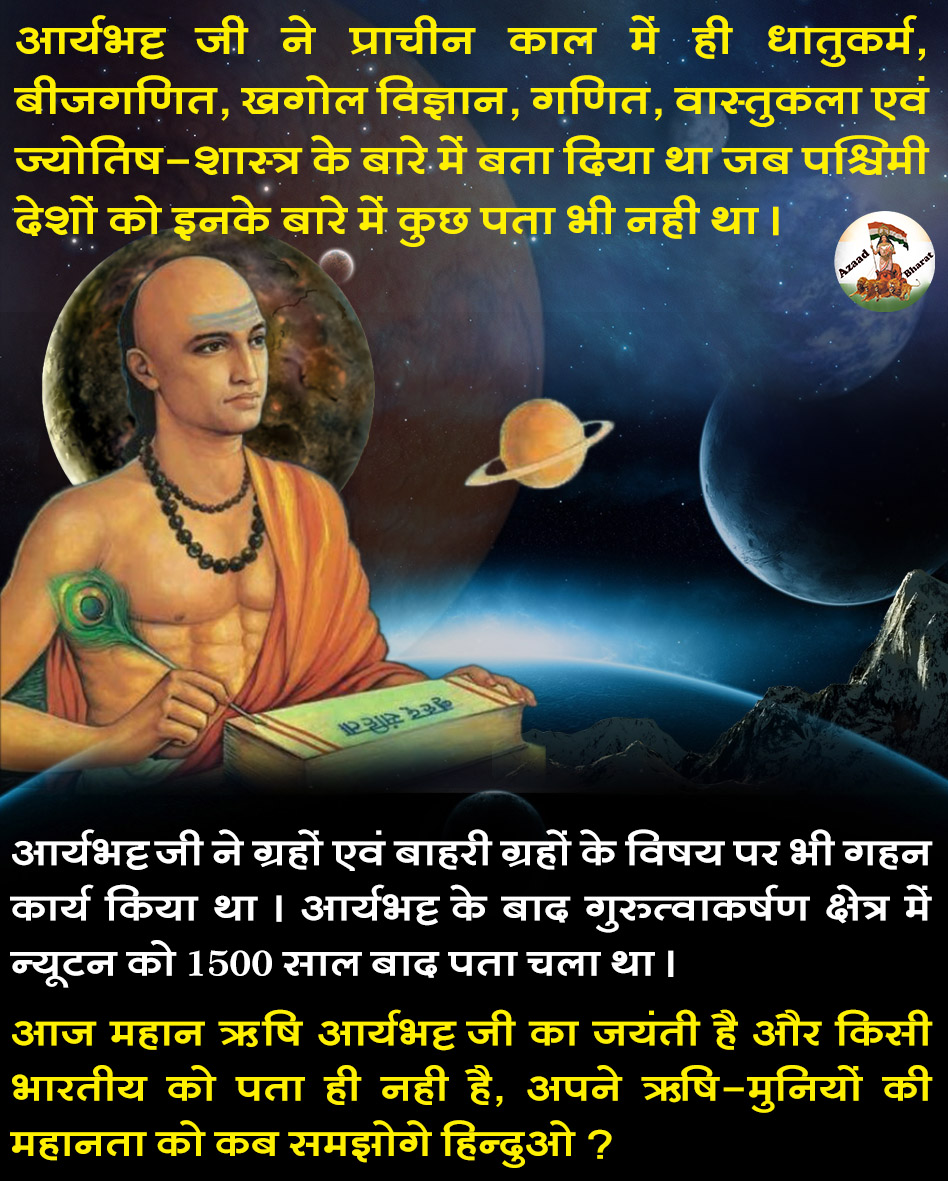🚩अंग्रेजो के पिट्ठुयो के  इतहास में लुटेरे, आक्रमणकारी मुगलों ओर अंग्रेजो का है इतिहास पढ़ाया जाता है वास्तव में जिन्होंने विश्व और समाज के लिए उपयोगी खोज किया उनका इतिहास ही खत्म कर दिया गया लेकिन उन महापुरुषों किसी परिचय के मोहताज नहीं थे और न ही झोलाछाप इतिहासकारों की लेखनी के बिना विस्मृत होने वाले हैं। उन तमाम महान आत्माओ में से एक हैं आर्यभट्ट । जिनका आज जयंतीहै। नासा आज भी उनकी ही शिक्षा से प्रयोगशाला चला रही है लेकिन अफ़सोस की बात तो ये है कि हम में से कोई भी उनके बारे में जानते ही नहीं हैं।