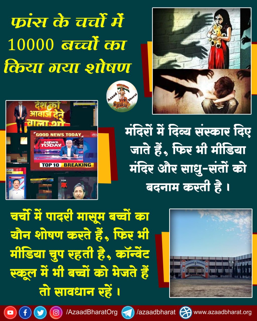 दुनियाभर में पादरी बच्चों का शोषण करते है लेकिन सेक्युलर, बुद्धजीवी और मीडिया हिन्दू धर्म के पवित्र मंदिर, आश्रमों व साधु-संतों पर षड्यंत्र के तहत कोई आरोप भी लगा दे तो खूब बदनाम करते हैं, परंतु इन ईसाई पादरीयों के दुष्कर्मो पर चुप रहते हैं क्या उन्हें वेटिकन सिटी से भारी फंडिंग मिलती है ?