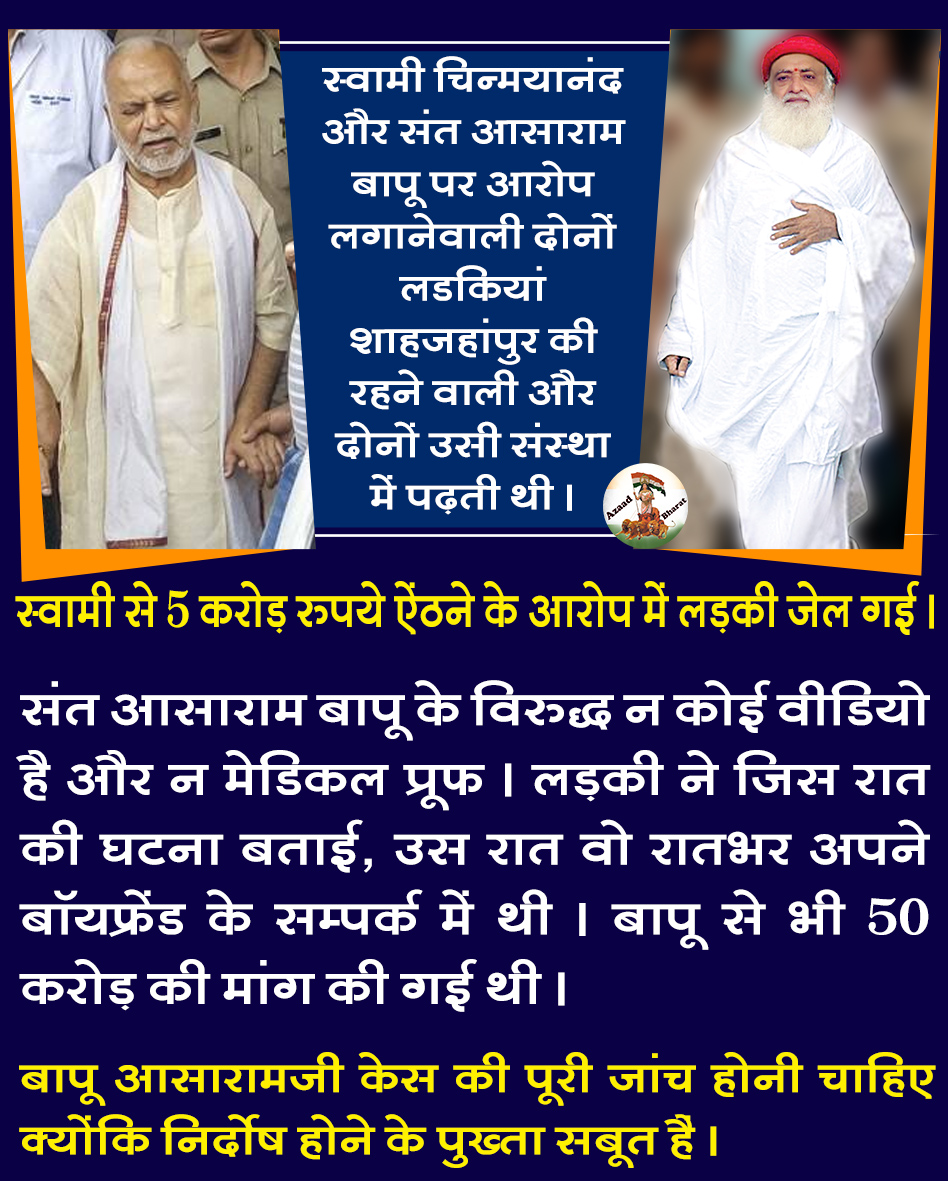 जब स्वामी चिन्मयानंद पर आरोप लगाने वाली लड़की को गिरफ्तार कर सकते हैं तो फिर संत आसाराम बापू पर आरोप लगानेवाली लड़की की भी जांच होनी चाहिए और उनके अकाउंट चेक होने चाहिए कि फंडिग कहाँ से आई क्योंकि बापू आसारामजी की निर्दोषता के पुख्ता सबूत सामने आये हैं ।