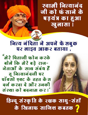 अभी हाल ही में स्वामी नित्यानंद जी को बदनाम किया जा रहा उनकी संस्था को लेकर उसके पीछे भी एक साजिश है और उस साजिश का पर्दाफाश नित्य नंदिनी नाम की बालिका ने किया है।*