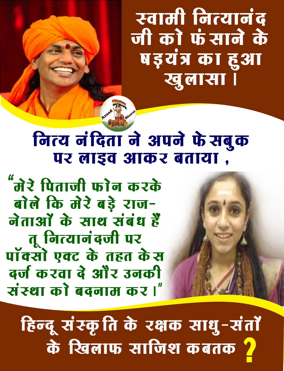 अभी हाल ही में स्वामी नित्यानंद जी को बदनाम किया जा रहा उनकी संस्था को लेकर उसके पीछे भी एक साजिश है और उस साजिश का पर्दाफाश नित्य नंदिनी नाम की बालिका ने किया है।*