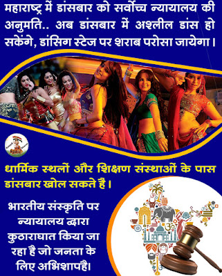 भारत में अगर धार्मिक स्थलों व् शैक्षणिक संस्थानों के पास डांस बार खोलेंगे तो व्यक्ति के अंदर अच्छे संस्कार की जगह बुरे संस्कार ही पढ़ेंगे और अश्लील डांस करेंगे व देखेंगे और शराब पियेंगे तो बलात्कार की घटनाएं बढ़ेंगे, एक्सीडेन्ट होने की संभावनाएं बढ़ेगी इसलिए महाराष्ट्र की विश्वप्रसिद्ध संत परंपरा को ध्यान में लेकर भाजपा सरकार को डान्सबार पर प्रतिबन्ध लगाने हेतु कानून लाना चाहिए ।
