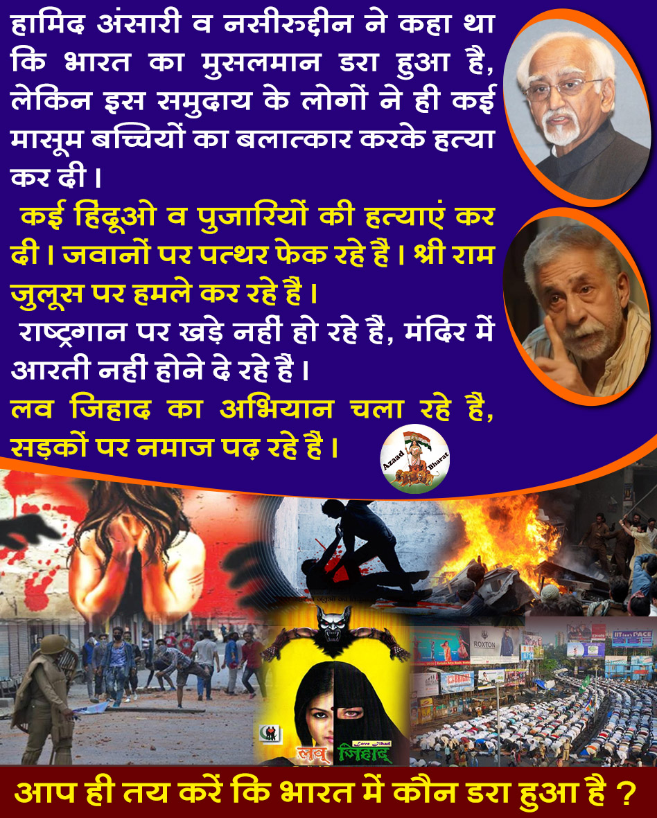 अंतरराष्ट्रीय स्तर पर भारत व हिंदुओं को बदनाम करने के लिए हामिद अंसारी तथा नसीरुद्दीन एवं आमिर खान की पत्नी बोलने लगती है कि भारत में मुसलमान डरा हुआ है, हिन्दू हिंसक है पर वास्तव में भारत का मुसलमान कितना डरा हुआ है, ये तय करने से पहले नीचे दी जा रही कुछ दिल दहलाने वाली घटनाओं के बारे में जान लीजिए जिससे आप तय कर सकते है कि वात्सव में कौन डरा हुआ है?