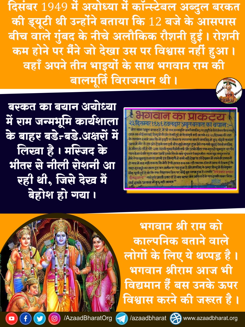 बरकत का बयान अयोध्या में राम जन्मभूमि कार्यशाला के बाहर बड़े-बड़े अक्षरों में लिखा है। इसमें बरकत के हवाले से कहा गया है- मस्जिद के भीतर से नीली रोशनी आ रही थी, जिसे देख मैं बेहोश हो गया।