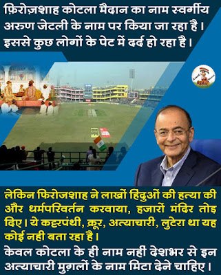 🚩दिल्ली के फ़िरोज़शाह कोटला मैदान का नाम स्वर्गीय अरुण जेटली के नाम पर किया जा रहा है। कुछ लोगों के पेट में इस कदम से दर्द हो रहा हैं हालाँकि बहुत कम लोगों को यह मालूम है कि फ़िरोज़शाह कौन था? फिरोजशाह तुगलक खानदान से था जिसने दिल्ली पर राज किया था। तुग़लको का राज ऐसा था कि आज भी तुग़लक़ शब्द अकर्मयता और नीतिगत अदूरदृष्टि का प्राय: समझा जाता हैं। इस खानदान के कुछ कारनामों से आपको परिचय होना होगा।