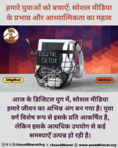 आज के डिजिटल युग में, सोशल मीडिया हमारे जीवन का अभिन्न अंग बन गया है। युवा वर्ग विशेष रूप से इसके प्रति आकर्षित है, लेकिन इसके अत्यधिक उपयोग से कई समस्याएँ उत्पन्न हो रही हैं। इस लेख में, हम सोशल मीडिया के नकारात्मक प्रभावों, आध्यात्मिकता के लाभों और युवाओं के लिए सुझावों पर चर्चा करेंगे।
