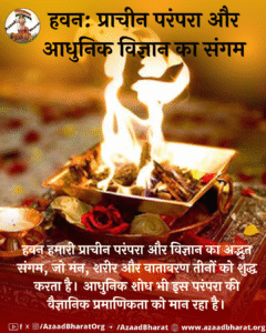 हवन भारतीय संस्कृति में एक प्राचीन अनुष्ठान है। इसे केवल धार्मिक कर्मकांड न मानकर स्वास्थ्य, वातावरण शुद्धि और मानसिक शांति का साधन माना गया है। आधुनिक शोध भी इस परंपरा की वैज्ञानिक प्रमाणिकता को मान रहा है।