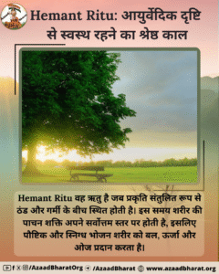 आयुर्वेद के अनुसार Hemant Ritu Ayurvedic Lifestyle को समझकर यदि इस समय सही भोजन, सही दिनचर्या और उचित सावधानी अपनाई जाए, तो शरीर की शक्ति, रोग-प्रतिरोधक क्षमता और मानसिक ऊर्जा कई गुना बढ़ जाती है। विस्तृत अध्ययन के लिए आप AzaadBharat.org पर अन्य आयुर्वेदिक और सांस्कृतिक लेख भी पढ़ सकते हैं।