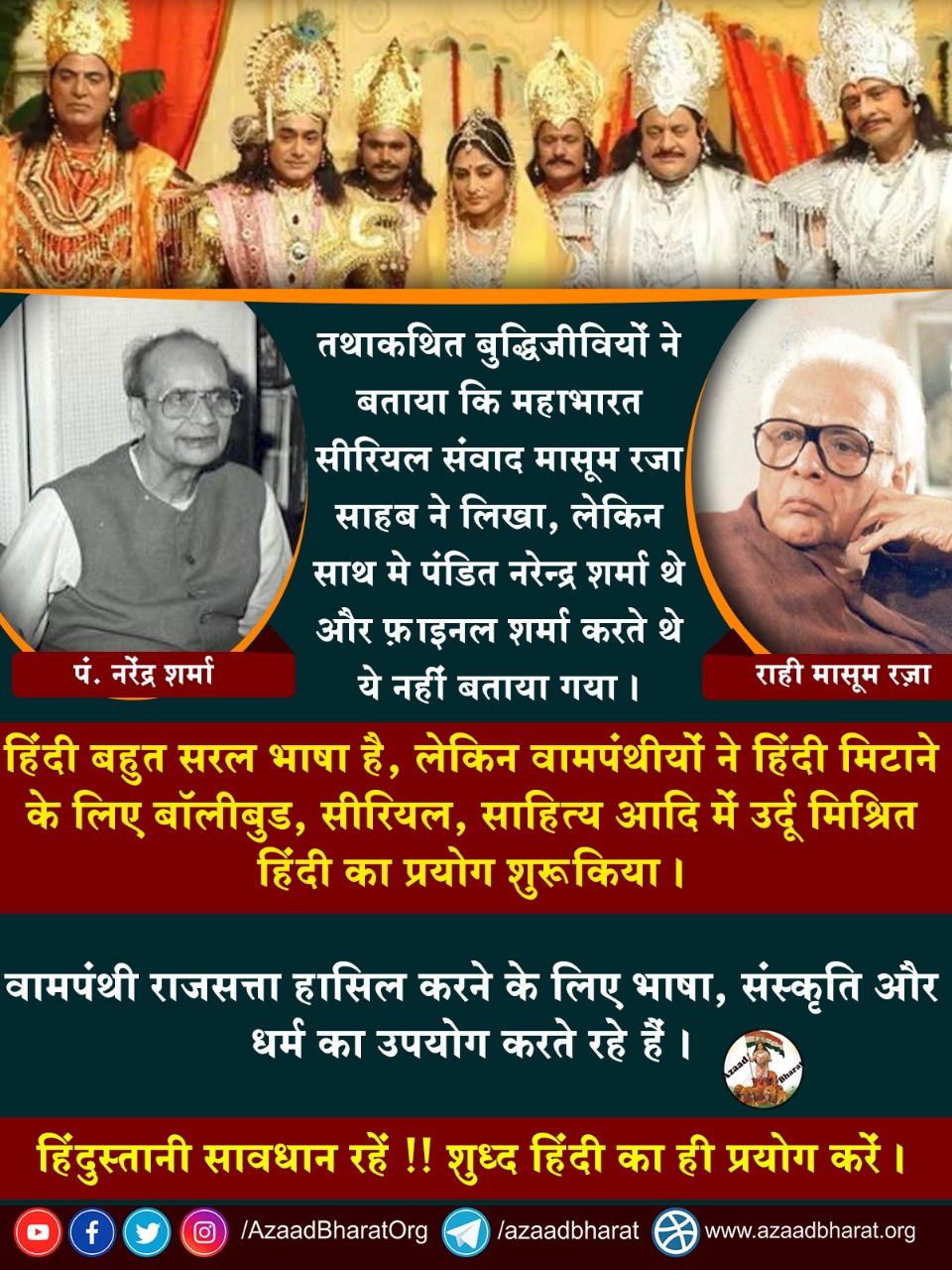 भाषा को दूषित करने के इस खेल में वामपंथियों ने भले ही उर्दू को अपना हथियार बनाया हो लेकिन वो न तो उर्दू के हितैषी हैं और न ही मुसलमानों के। अगर राही मासूम रजा की इतनी ही कद्र या फिक्र होती तो उनको हिंदी में बेहतरीन कृतियां लिखने पर साहित्य अकादमी पुरस्कार मिल जाता। साहित्य अकादमी में तो उन्नीस सौ पचहत्तर के बाद से वामपंथियों का ही बोलबाला रहा। सिर्फ राही मासूम रजा ही क्यों किसी भी मुसलमान लेखक को इन वामपंथियों ने आजतक हिंदी में लिखने के लिए साहित्य अकादमी पुरस्कार नहीं दिया, शानी के ‘काला जल’ को भी नहीं, रजा के ‘आधा गांव’ को भी इन्होंने इस लायक नहीं समझा। दरअसल ये अपनी विचारधारा को मजबूत बनाने और अपने और अपने राजनीतिक आकाओं के हितों की रक्षा के लिए भाषा, धर्म समाज सबका उपयोग करते रहे हैं। ये विचारधारा समावेशी नहीं है। कई बार ऐसा प्रतीत होता है कि इसका वैचारिक आधार स्वार्थ है और ये राजसत्ता हासिल करने के लिए भाषा, संस्कृति या धर्म का उपयोग करना चाहते हैं। साहित्य और संस्कृति को इस विचारधारा वालों ने राजनीति का औजार बनाकर इन विधाओं का इतना नुकसान किया जिसकी भारपाई निकट भविष्य में तो संभव नहीं है। जरूरत इस बात की है कि भाषाई अस्मिता के साथ खिलवाड़ न किया जाए, भाषा के नियमों के साथ छेड़-छाड़ नहीं की जाए। बॉलीवुड में विचारधारा के नाम पर लंबे समय तक बहुत ही खतरनाक खेल खेला गया, अब भी कई लोग ये खेल खेलना चाहते हैं, खेल भी रहे हैं लेकिन अब बेहद चालाकी से ऐसा करते हैं ताकि पकड़ में न आ सकें लेकिन वामपंथी ये भूल जाते हैं कि ये जनता है और वो सब जानती है। महाभारत के संवादों के अर्धसत्य पर अनंत विजय का लेख (साभार: दैनिक जागरण)