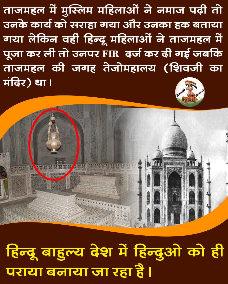 अभी हाल ही एक घटना घटित हुई है जिसमें ताजमहल में कुछ मुस्लिम महिलाओं ने नमाज पढ़ी तो उनके कार्य को सराहा गया और इसे उनका हक बताया गया लेकिन वहीं हिन्दू संगठन की कुछ महिलाओं ने ताजमहल में पूजा कर ली तो देश का सेकुलरिज्म खतरे में आ गया और सेकुलरिज्म को इस खतरे से बाहर निकालने के लिए हिन्दू संगठन की महिलाओं के मौलिक अधिकारों को भी दरकिनार करते हुए उनपर FIR दर्ज कर दिया गया ।