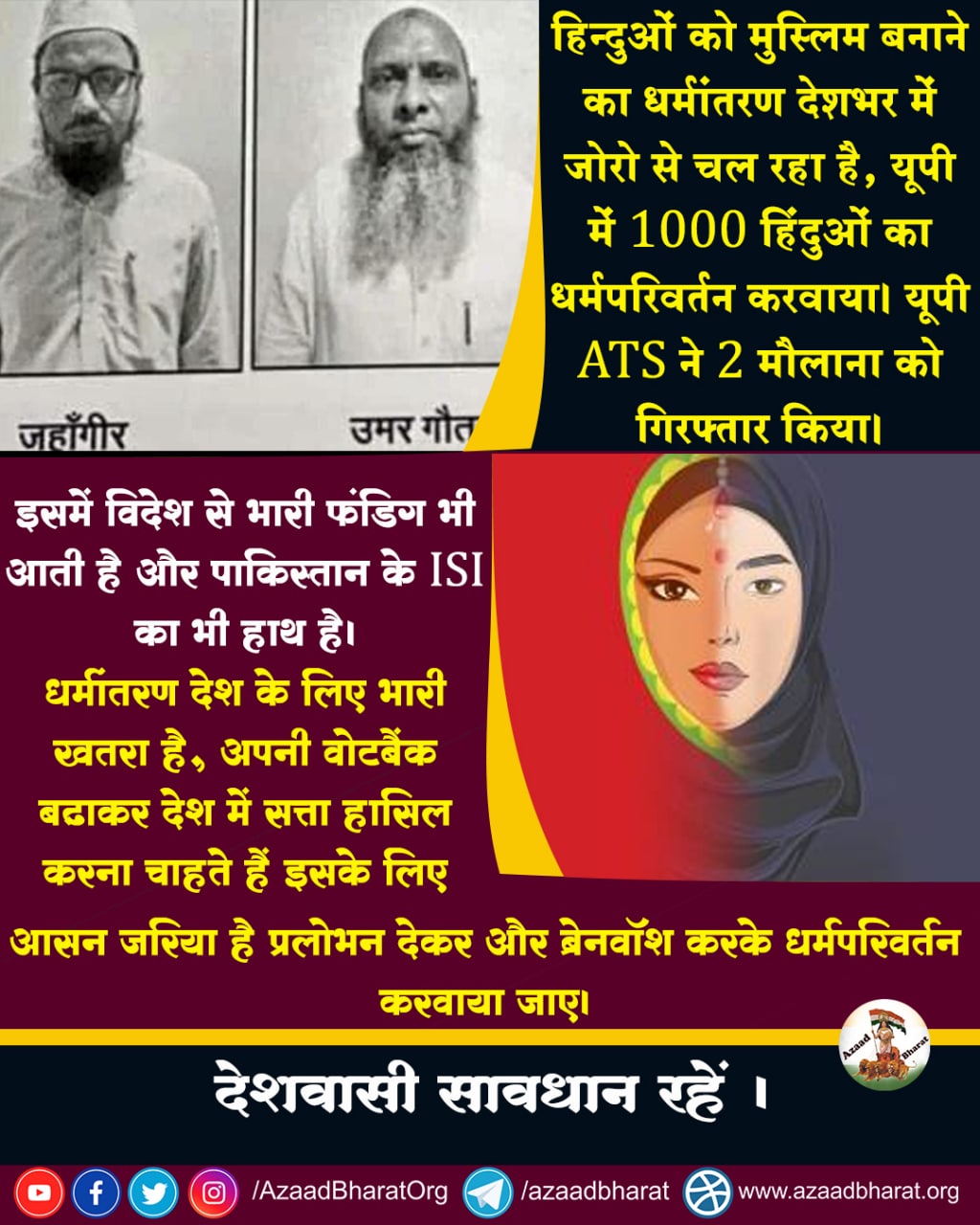 इतना ही नहीं ये लोग उनके मूल हिन्दू धर्म के प्रति नफरत फैलाकर उन्हें संगठित अपराध के लिए भड़का रहे थे। इस सूचना पर यूपी एटीएस ने कार्रवाई करते हुए दोनों मौलानाओं को गिरफ्तार किया है।