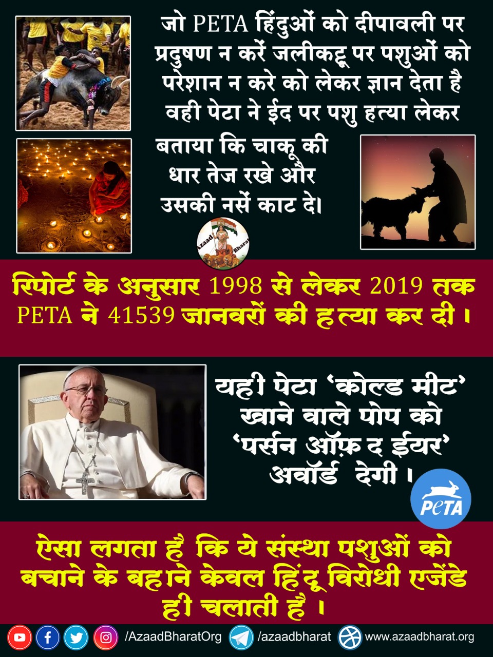 PETA यानी पीपल फॉर द एथिकल ट्रीटमेंट ऑफ एनिमल्स। यह संस्था खुद को पशुओं के अधिकार का संरक्षक कहती है। लेकिन इस मुखौटे के पीछे कई चेहरे छिपे हैं। हिंदुओं से घृणा करने वाली यह संस्था जानवरों की निर्ममता से हत्या भी करती है। दीपावली पर ज्ञान देती है कि पटाखे नही फोड़े नही तो पशु पक्षी डर जाते है लेकिन यही पेटा बकरी ईद पर बता रही है कैसे पशु हत्या करनी चाहिए, पूरा विधि बता रही हैं।
