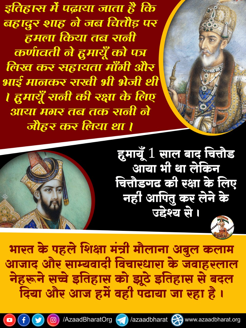 बचपन में हमें अपने पाठयक्रम में पढ़ाया जाता रहा है कि रक्षाबंधन के त्योहार पर बहनें अपने भाई को राखी बांध कर उनकी लम्बी आयु की कामना करती हैं। रक्षा बंधन का सबसे प्रचलित उदाहरण चित्तोड़ की रानी कर्णावती और मुगल बादशाह हुमायूँ का दिया जाता है। कहा जाता है कि जब गुजरात के शासक बहादुर शाह ने चित्तोड़ पर हमला किया तब चित्तोड़ की रानी कर्णावती ने मुगल बादशाह हुमायूँ को पत्र लिख कर सहायता करने का निवेदन किया। पत्र के साथ रानी ने भाई समझ कर राखी भी भेजी थी। हुमायूँ रानी की रक्षा के लिए आया मगर तब तक देर हो चुकी थी। रानी ने जौहर कर आत्महत्या कर ली थी। इस इतिहास को हिन्दू-मुस्लिम एकता तोर पर पढ़ाया जाता हैं।