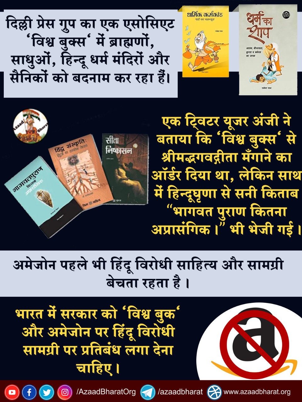 इससे पहले एक ट्विटर यूजर अंजी ने खुलासा किया था कि उन्होंने अमेजॉन के जरिए विश्व बुक्स से श्रीमद्भगवद्गीता मँगाने का ऑर्डर दिया था लेकिन साथ में हिन्दूघृणा से सनी किताब भी आई। जब उनके ऑर्डर की डिलीवरी हुई, तो उसके साथ एक और बुक थी जिसका शीर्षक था- “भागवत पुराण कितना अप्रासंगिक।” उक्त पुस्तक पुराण का प्रतिवाद है और पाठकों को पुराण पढ़ने से रोकने के लिए स्पष्ट रूप से लक्षित है।