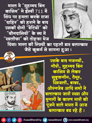 ★ सबसे पहले 711 ईस्वी में “मुहम्मद बिन कासिम” ने सिंध पर हमला करके राजा “दाहिर” को हराने के बाद उसकी दोनों “बेटियों” को “यौनदासियों” के रूप में “खलीफा” को तोहफा भेज दिया। तब शायद भारत की स्त्रियों का पहली बार बलात्कार जैसे कुकर्म से सामना हुआ जिसमें “हारे हुए राजा की बेटियों” और “साधारण भारतीय स्त्रियों” का “जीती हुयी इस्लामी सेना” द्वारा बुरी तरह से बलात्कार और अपहरण किया गया ।