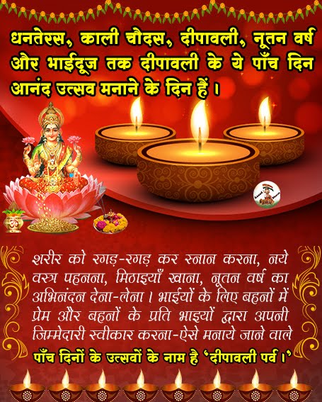 शरीर को रगड़-रगड़ कर स्नान करना, नए वस्त्र पहनना, मिठाइयाँ खाना, नूतन वर्ष का अभिनंदन देना-लेना । भाईयों के लिए बहनों में प्रेम और बहनों के प्रति भाइयों द्वारा अपनी जिम्मेदारी स्वीकार करना – ऐसे मनाए जाने वाले 5 दिनों के #उत्सवों के नाम है ‘#दीपावली पर्व ।’
