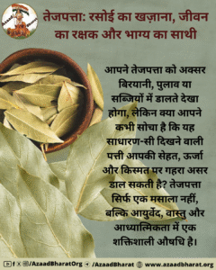 तेजपत्ता दिखने में जितना साधारण है, उसके फायदे उतने ही असाधारण हैं। यह सेहत को सुधारने से लेकर ऊर्जा को शुद्ध करने और किस्मत को चमकाने तक, कई रूपों में चमत्कार दिखाता है। अगली बार जब आप इसे अपने खाने में डालें, तो यह न सोचें कि आप बस स्वाद बढ़ा रहे हैं—आप अपने जीवन में स्वास्थ्य, सकारात्मक ऊर्जा और समृद्धि भी मिला रहे हैं।
