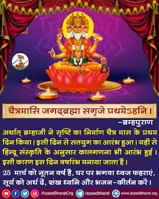 *अर्थात ब्रम्हाजी ने सृष्टि का निर्माण चैत्र मास के प्रथम दिन किया । इसी दिन से सतयुग का रंभ हु । यहीं से हिन्दू संस्कृति के अनुसार कालगणना भी रंभ हुई । इसी कारण इस दिन वर्षारंभ मनाया जाता है ।*