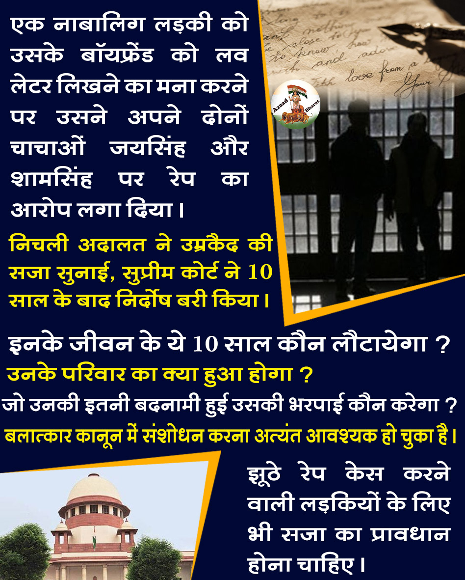 फरीदाबाद जिले में एक नाबालिग लड़की पास के ही एक लड़के से प्रेम करती थी, और उसे प्रेम पत्र भी लिखे थे । ये पत्र उसके चाचाओं के हाथ लग गए और उन्होंने लड़की को समझाया और जब वो नहीं मानी तो थप्पड़ जड़ दिए । इससे तिलमिलाई लड़की ने अब से ठीक 17 साल पहले यानी 22 अगस्त 2001 को दोनों चाचाओं जय सिंह और शाम सिंह पर रेप का आरोप लगाया।