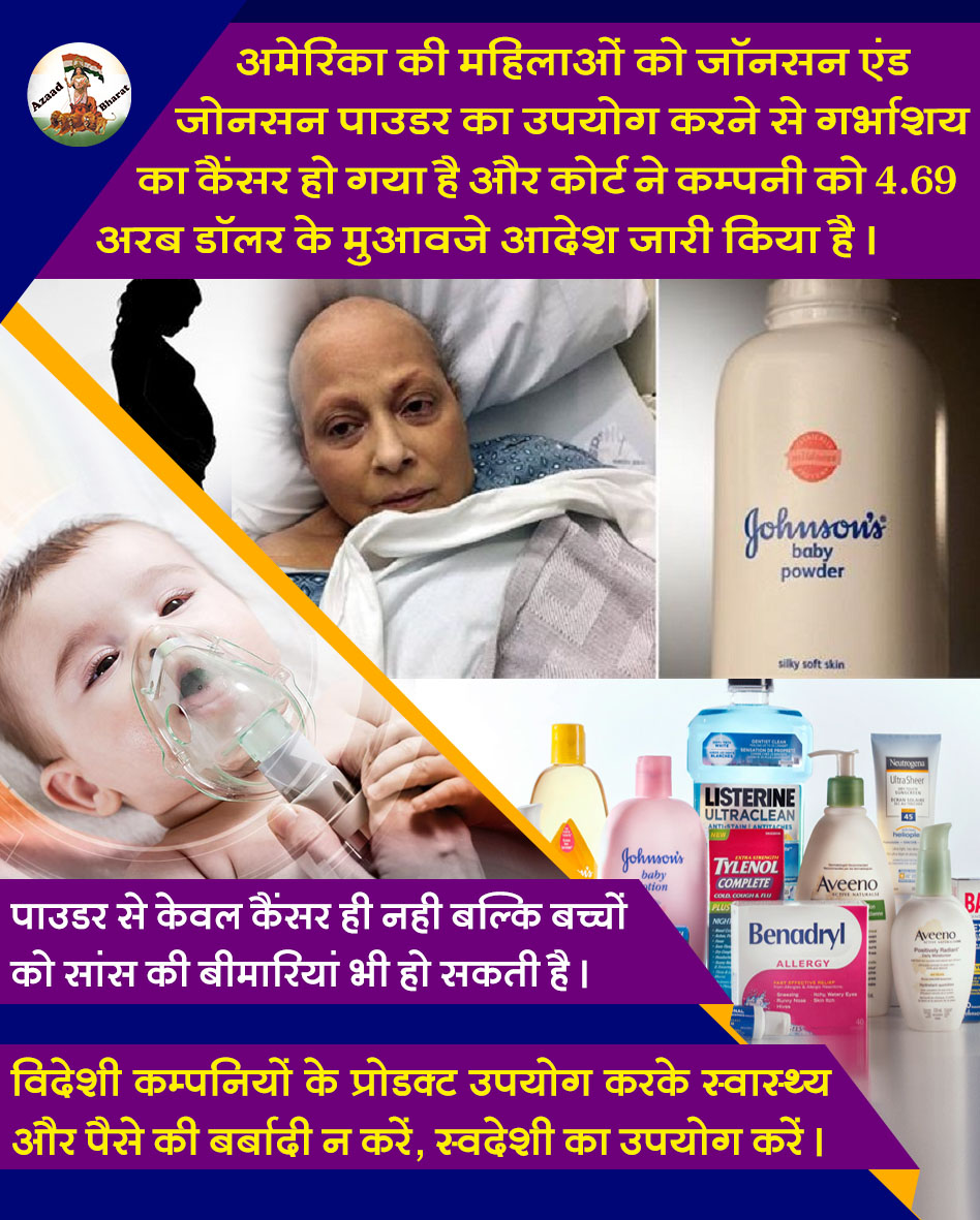 बहुत सी माताएं बहनें अपने नवजात शिशुओ छोटे बच्चों की मालिश जॉन्सन बेबी तेल से करती है। गाँव में रहने वाली बहनें एवं शहरी पढ़ी लिखी माताएं भी इस तेल के जाल में भ्रमित हैं। टीवी पर प्रचार की वजह से ये तेल लोगो के दिमाग में छा गया है। अधिकांश पढ़े लिखे लोग भी ये विश्वास नहीं करेंगे की इस जॉन्सन बेबी तेल में सिर्फ मिट्टी का तेल है। जी हाँ केरोसिन घासलेट । यकीन नहीं होता तो सीसी पर कम्पोजीशन पढ़िएगा। उसमे लिखा है की mineral oil ,vitamin E बस और कुछ नहीं। दाम देखिये दो सौ रुपये में दो सौ मिली लीटर। यानि हजार रुपये लीटर। माँ बहने इस तेल से मालिश करने में गर्व महसूस करती है क्योंकि प्रचार के बल पर ब्रेन वाश कर दिया है विदेशी कम्पनी ने।