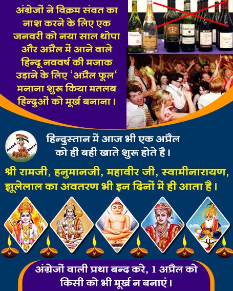 भारत में अंग्रेज़ो ने विक्रम संवत का नाश करने के लिए ही 1 जनवरी को नया साल थोपा और अप्रैल में आने वाले हिन्दू नववर्ष की मजाक उड़ाने के लिए ही “अप्रैल फूल” मनाना शुरू किया मतलब हिन्दुओं को मूर्ख बनाये जिससे वे खुद का नया साल भूल जाये ।