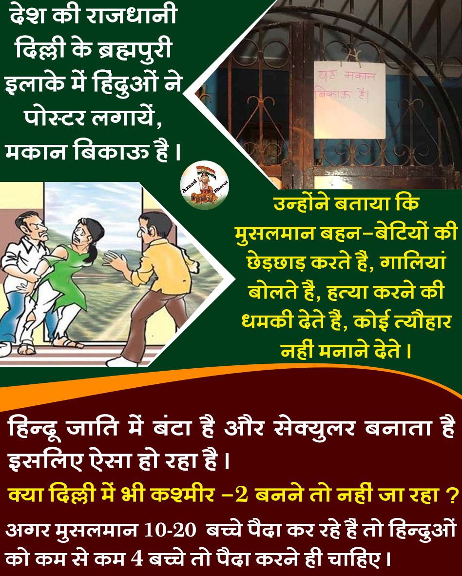 राजधानी दिल्ली के उत्तर पूर्वी जिले का ब्रह्मपुरी इलाके के गली नंबर 8 में रहने वाले हिन्दू परिवारों ने अपने अपने घरों के बहार ‘ये मकान बिकाऊ है’ का पोस्टर चिपका दिया है। हिन्दू परिवारों का मानना है कि गली में मुस्लिम समुदाय के लोग उनको जान बूझकर परेशान कर रहे हैं। हिन्दूओं ने बताया कि मुस्लिम लोग गली में कुछ इस तरह बाइक खडी कर देते हैं कि आने जाने का रास्ता ही बंद हो जाता है।